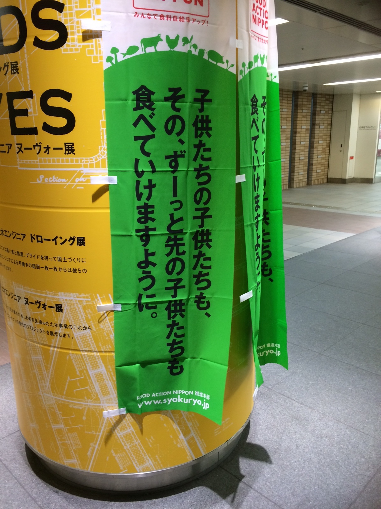「そう問われているんだなぁ」と ティンバライズの展覧会を観た私は思いながら 二重橋前駅から東京駅まで歩いていると、行幸地下ギャラリー前で「丸の内 行幸マルシェ×青空市場」が開かれていました。色とりどり 様々な農産物が並ぶなか ところどころに立てられた緑の旗には、未来の子どもたちのためにいまどういう食を選ぶのか を問う言葉が記されていました(*正確な文言は覚えていないので もしかしたら正しくないかもしれません/【追記】を参照下さい)。